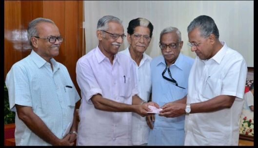 SCFWA donates to Chief Minister’s Ockhy Relief Fund. P.V.Chandrasekharan, R.Rajan, Amaravila Ramakrishnan and C.P.Ravindran, office bearers of Senior Citizens Friends Welfare Association handing over Cheque for RS. One lakh towards Ockhy Relief Fund to Chief Minister Pinarayi Vijayan.