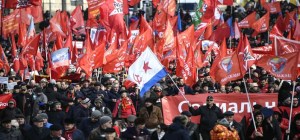 Russian Communist supporters carry flags and banners protesting in downtown Moscow on March 23, 2019. Thousands of Communist supporters protested against social economics policy of Russia’s Government.