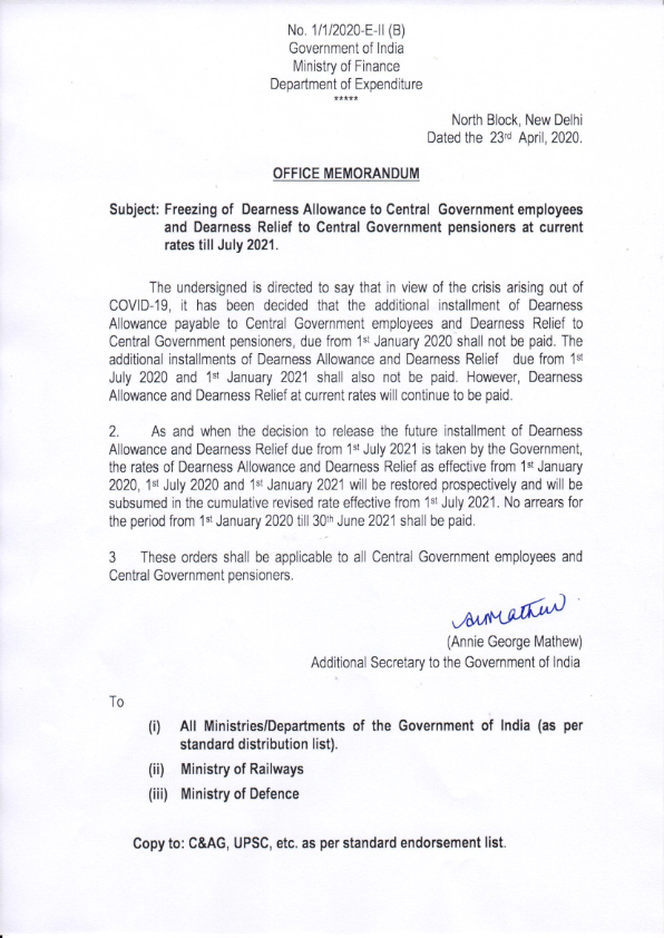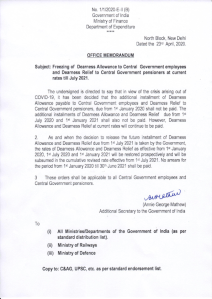 Three Central DA frozen for for employees as well as pensioners. 23 Thursday Apr 2020 Posted by VAN NAMBOODIRI in CG Employees, General, Pension, Uncategorized ≈ 2 Comments Government has issued orders freezing eligible DA due from January,July 2020 and January 2021 for Central government employees and pensioners. No arrears will be given afterwards. The order has been issued today, 23rd April 2020. Share this: Click to share on Facebook (Opens in new window) Facebook Click to share on X (Opens in new window) X Click to print (Opens in new window) Print Click to email a link to a friend (Opens in new window) Email Like Loading... Related