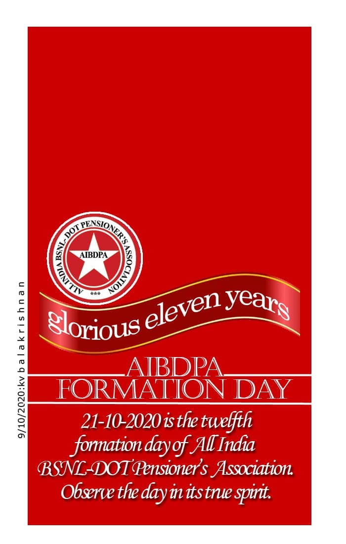 Our mighty and beloved organization, All India BSNL DOT Pensioners Association, is completing 11 years and the 12th Foundation Day on 21-10-2020 deserves to be celebrated in a befitting manner. Let us celebrate with hoisting the AIBDPA flag, holding General Body meetings, distributing sweets, distributing food/clothes to the needy etc. In the meeting, the achievements and the onward march of AIBDPA through the path of struggles , Cordial relationship with the serving employees organizations and joining their struggles, our affiliation with NCCPA, the umbrella organization of pensioners organizations in India and TUI(P&R), the international pensioners organization and constituent of WFTU and the tasks ahead for pension revision and payment of medical benefits, revival of BSNL etc. are to be explained.