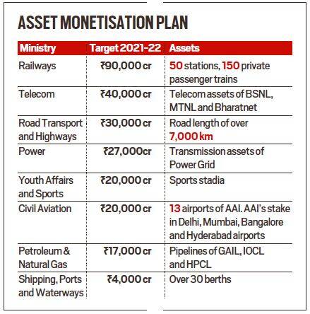 Modi Government has plans to sell many important and strategic assets of the nation, including that of Railways, Telecom, Power, Transport and Civil Aviation. The target for 2021-22 is given below in a table form. 50 Railway Stations and 150 passenger trains will be privatised through which the government expects Rs.90,000 crore. Telecom assets including towers and copper cables will be on sale to fetch Rs. 40,000 crore. 13 Airports are in the list.