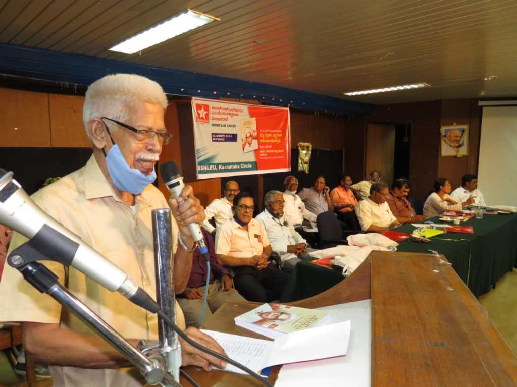 The book written by me, ‘My Life, Struggles’ (autobiography), which was posted in Facebook for 80 continuous days, was published by Karnataka BSNLEU Circle taken initiative by Circle President Com. C.K.Gundanna and Circle secretary Com.H.V.Sudharshan in a special meeting arranged along with the CEC meeting of BSNLEU on 22nd March 2021, which also was the 20th anniversary of foundation of BSNLEU. The book was released by Com.Amanulla Khan, former President of AIIEA and editor of Insurance Worker. Circle leaders of BSNLEU, AIBDPA and BSNLCCWF participated and addressed. More than 200 comrades participated. Congratulations to Karnataka Comrades!