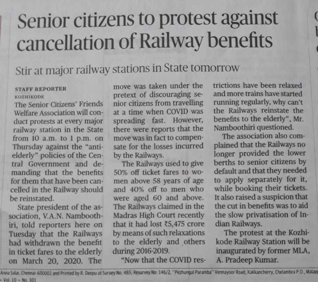Senior Citizens Friends Welfare Association, Kerala will be organizing protest dharna in front of Railway Stations on 23rd December 2021 demanding restoration of the Railway ticket concessions, withdrawn during the Covid period. Women aged 58 and above were getting 50% concession in Railway tickets and men aged 60 and above were getting 40% concession. These were withdrawn by the government wef 20th February 2020. The demand is to restore them.