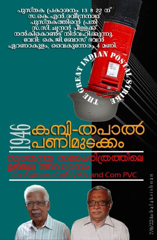 Book on the Historic 1946 P&T Strike, part of Independence Struggle, written by V.A.N.Namboodiri and P. V.Chandrasekharan will be released by veteran trade union leader Com. K.N.Ravindranth by handing over the same to Com. C.C.Pillai, former Secretary General NFPE and Confederation. Leaders of various unions will address. The meeting will take place at KG Bose Bhavan at 04.00 P.M. on 13th August 2022. The book is being published by AIBDPA.