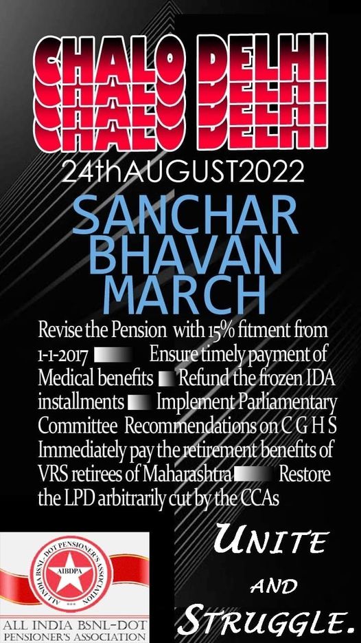 All India BSNL DoT Pensioners Association (AIBDPA) is organising a March to Sanchar Bhawan on 24.08.2022, demanding settlement of Pension Revision w.e.f. 01.01.2017 and settlement of other important demands of the pensioners. The Co-ordination Committee of BSNLEU, AIBDPA and BSNL CCWF, has decided to participate in this programme and make it a success. Hence, leaders and comrades of BSNLEU, especially circles adjacent to Delhi, are requested to participate in this rally and to make the programme a success. (courtesy: BSNLEU Website)