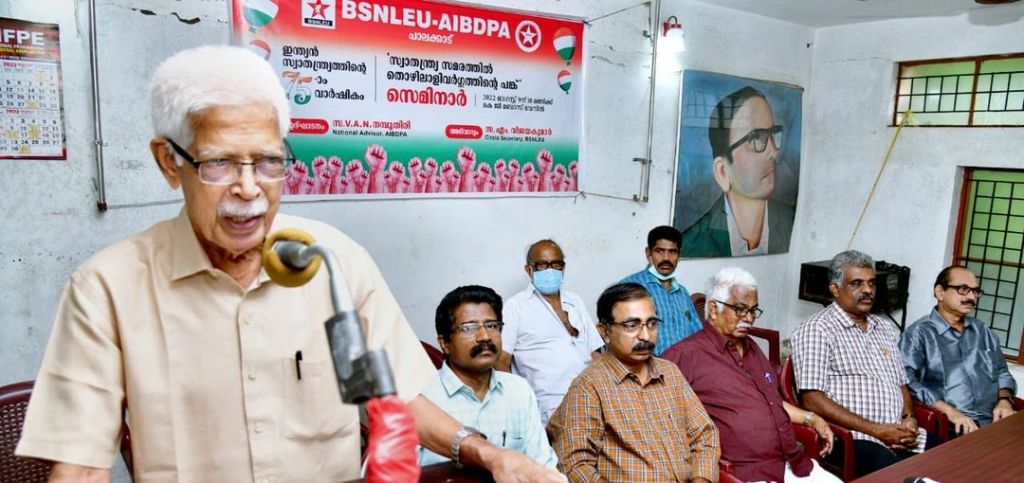 Convention by Coordination Committee of BSNLEU- AIBDPA- BSNLCCWF at Thrissur on 8th August 2022 on ‘ Workers Role in Freedom Struggle’ in connection with the celebration of 75th Anniversary of Independence. Com.P.G. Vasudevan, Dist. President AIBDPA presided. Com. V.A.N. Namboodiri inaugurated the Convention. Comrades K.R.Krishna Das, DS BSNLEU, K.Krishnan Kutty, DS, AIBDPA, Jijo Jose, DS CCWF, A.S.Rajan, Circle Vice- President, S.K.Gopalan, senior leader and others addressed. A large number of workers, including many women comrades participated.