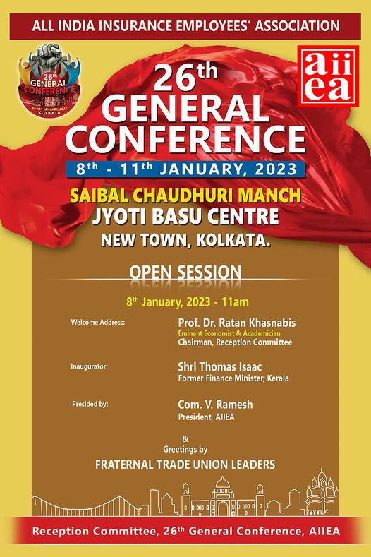 The All India Insurance Employees Association (AIIEA) is holding its 26th General Conference at Kolkata on 8-11 January 2023. It is one of the strongest union among the PSU Unions and represents vast majority of its workers. Since its formation , it has been perusing a progressive and democratic outlook and has conducted many successful strikes to achieve the just rights of the Insurance workers. Even now, it is fighting against disinvestment of LIC and making massive propaganda against the anti-worker, anti-PSU policy of the government.