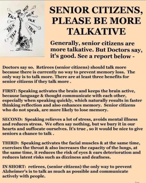 Seniors should talk – Good for health 04 Saturday May 2024 Posted by VAN NAMBOODIRI in Uncategorized ≈ Leave a comment മുതിർന്ന പൗരന്മാരേ , സംസാരിക്കുക, വീണ്ടും സംസാരിക്കുക. സംസാരം ആരോഗ്യത്തിനു ഗുണകരം. താഴെ കൊടുത്ത കുറിപ്പ് വായിക്കുക. വി എ എൻ 04.05.2024 Share this: Click to share on Facebook (Opens in new window) Facebook Click to share on X (Opens in new window) X Click to print (Opens in new window) Print Click to email a link to a friend (Opens in new window) Email Like Loading... Related