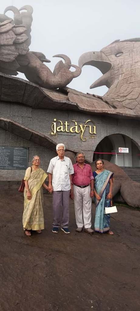 സ. സുകുമാരൻ നായർക്കും ശ്രീമതി ഉഷ ടീച്ചർക്കുമൊപ്പം കൊല്ലത്തെ ജടായു പാറയിൽ. കുന്നുകയറലും ലിഫ്റ്റിൽ യാത്രയും മഴയത്തു ജടായു ശില്പത്തിന്റെ ചുറ്റും പ്രദക്ഷിണം വെക്കലും എല്ലാം കൂടി ഒരു സായാഹ്നം അതിമനോഹരമായി കഴിഞ്ഞു. തിരിച്ചു വീട്ടിലെത്തി ഉഷ ടീച്ചറുടെ വളരെ രുചികരമായ ഭക്ഷണവും.