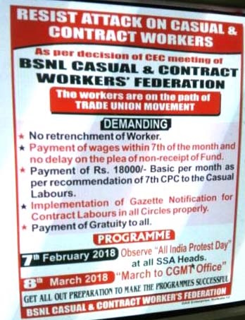 (1) Protest Day on 7th February, 2018, 2) March to CGMT Office on 8th March, 2018, 3) Signature Campaign, 4) Submission of Memorandum to the CMD and CLC, 5) Membership campaign programme, 6) Celebration of Ten Years completion of BSNLCCWF etc.