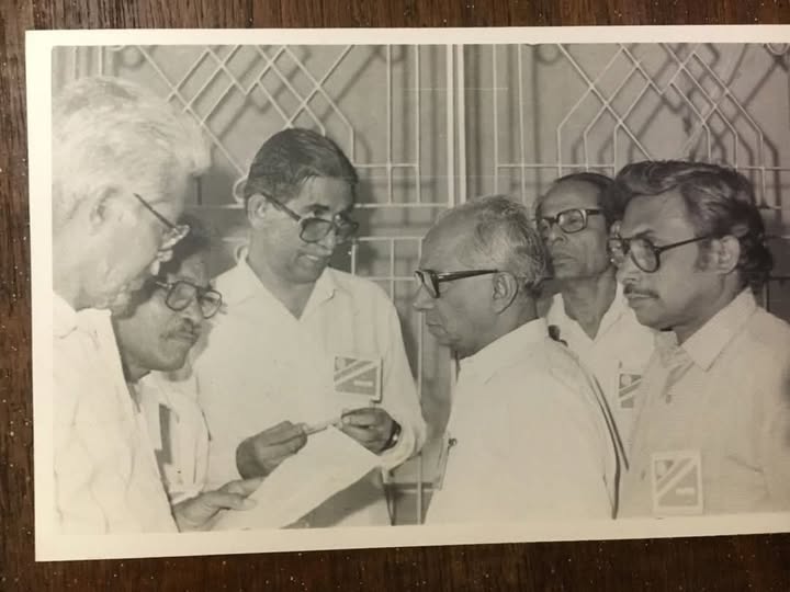 കുറെ വർഷങ്ങൾക്ക് മുമ്പേയുള്ള ഫോട്ടോ ആണ്.. Black & white. എന്തോ ഗൂഢാലോചന പോലെ തോന്നുന്നു. ഇ. III യൂണിയന്റെ (NFPTE ) അഖിലേന്ത്യ നേതാക്കളായ സഖാക്കൾ വി എ എൻ നമ്പൂതിരി, ശിബ്ദാസ് ബാനർജി , മണി ബോസ്, എ കെ ഭട്ടാചാര്യ, പി വി ചന്ദ്രശേഖരൻ എന്നിവർ എന്തോ കാര്യമായ ആലോചനയിലാണ്. അഖിലേന്ത്യ സമ്മേളനത്തിൽ പുരോഗമന വിഭാഗത്തിന്റെ തന്ത്രം മെനയുകയാണോ?