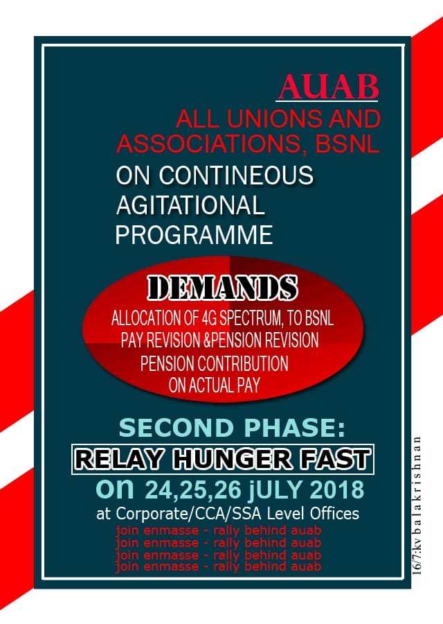AUAB has called for 3 days Relay Hunger Strike in front of Offices on the demands of Wage revision, Pension Revision, Allocation of 4 G Spectrum to BSNL etc.